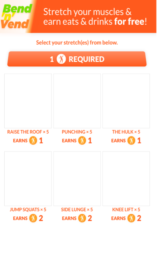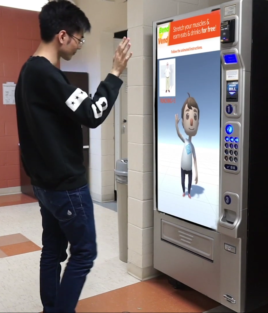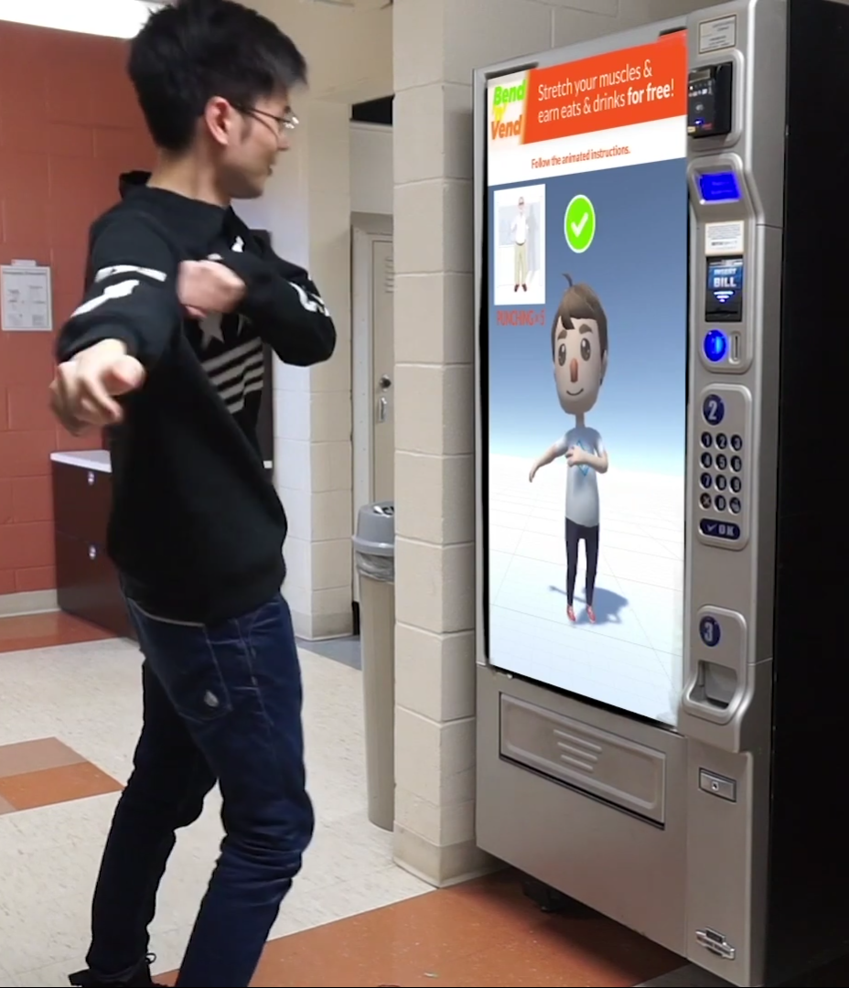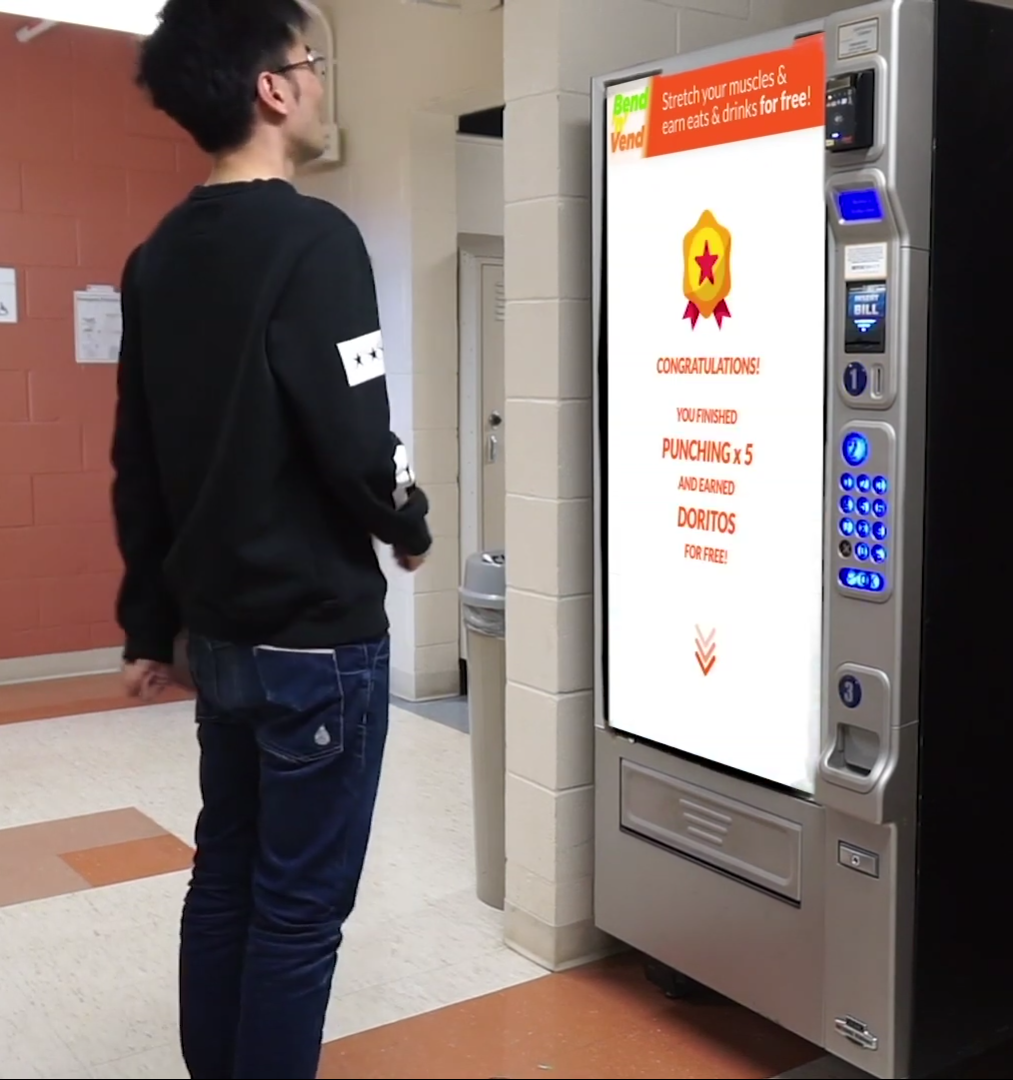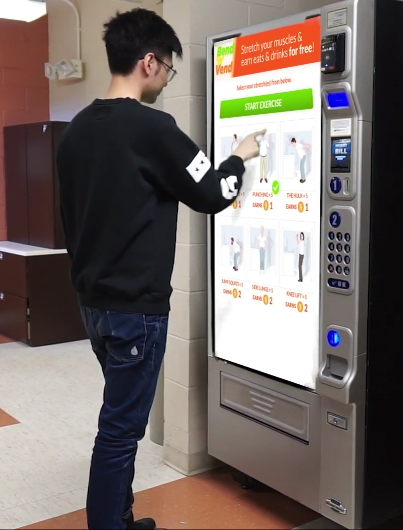 Our proposed design is a Vending Machine called Bend ‘N’ Vend which can be used to get free food and snacks by doing simple exercises. The purpose of Bend ‘N’ Vend is to break people’s sedentary habits and encourage movement. This can be while at work, at an academic institution or some other location. Bend ‘N’ Vend offers interactivity, incentives and long term health benefits thus being an ideal addition to any shared space.