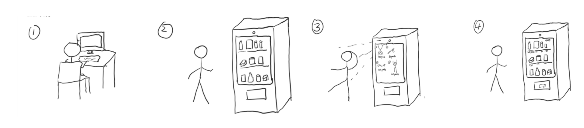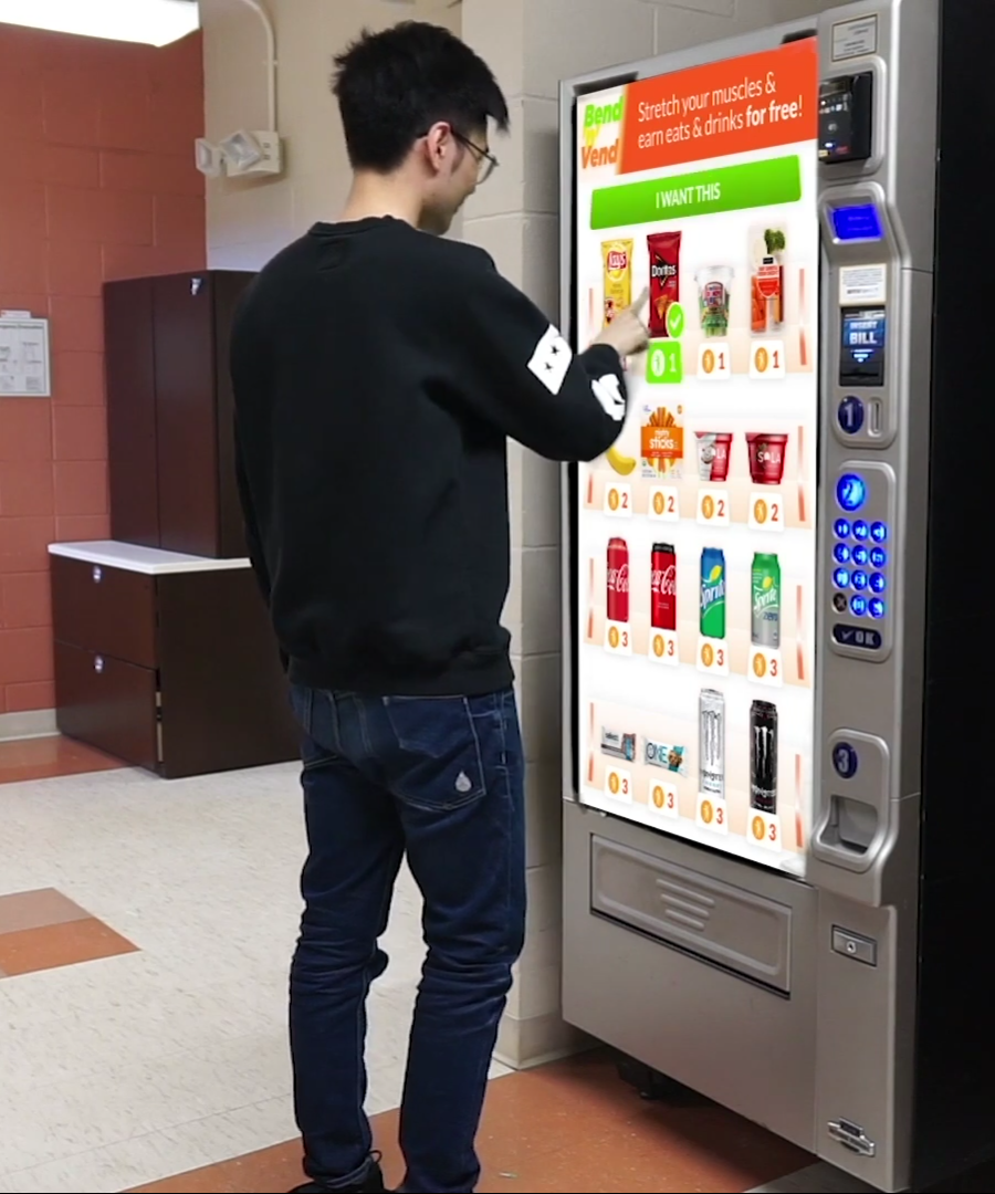 Bend ‘N’ Vend is a Vending Machine that takes payment in the form of exercise. The purpose of Bend ‘N’ Vend is to break people’s sedentary habits and encourage movement. This can be while at work, at an academic institution or even while at some other location. Free food is provided as an incentive to get people to use the Vending Machine.